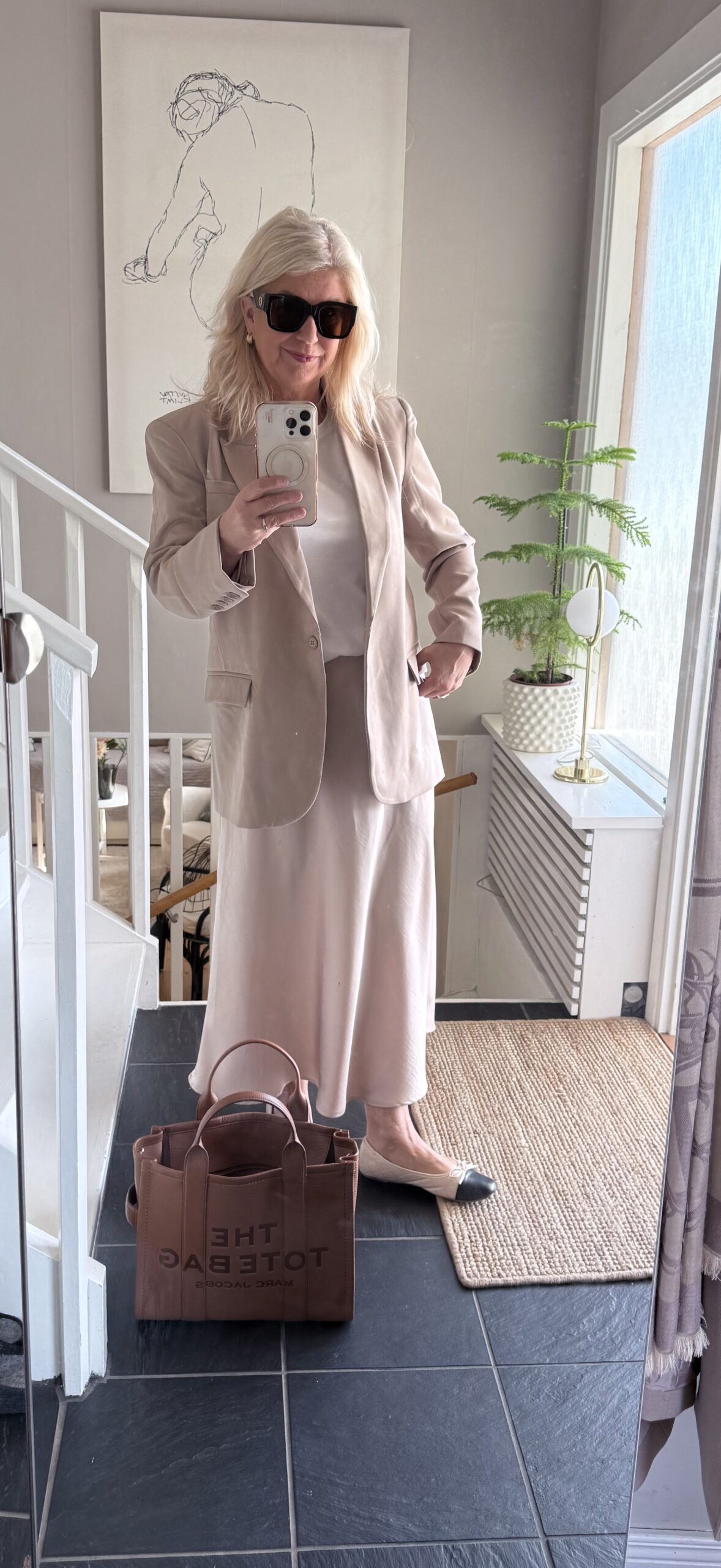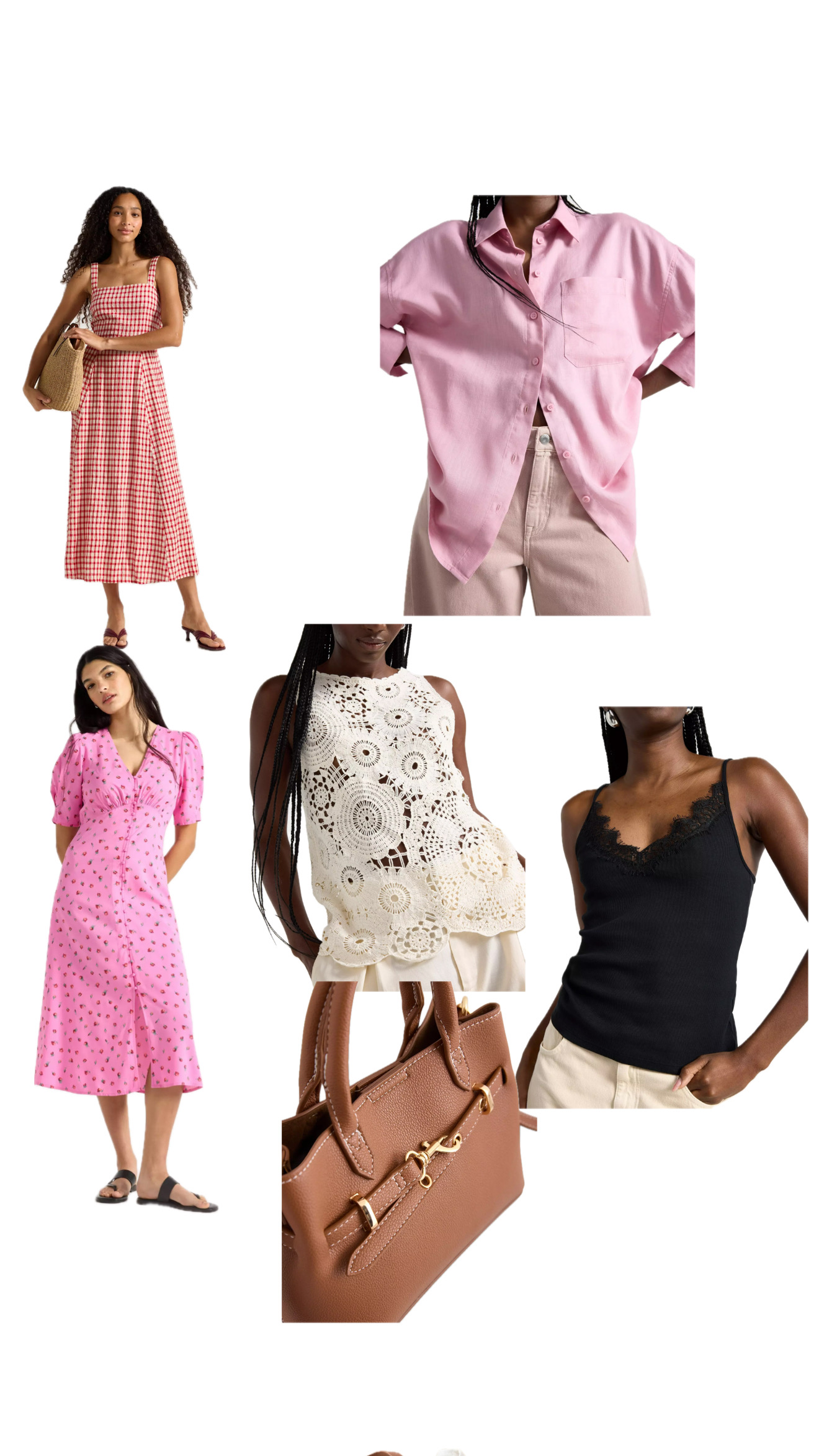 Rutig klänning, här Linneskjorta här, Rosa klänning här, Topp här, Svart linne här, Väska här