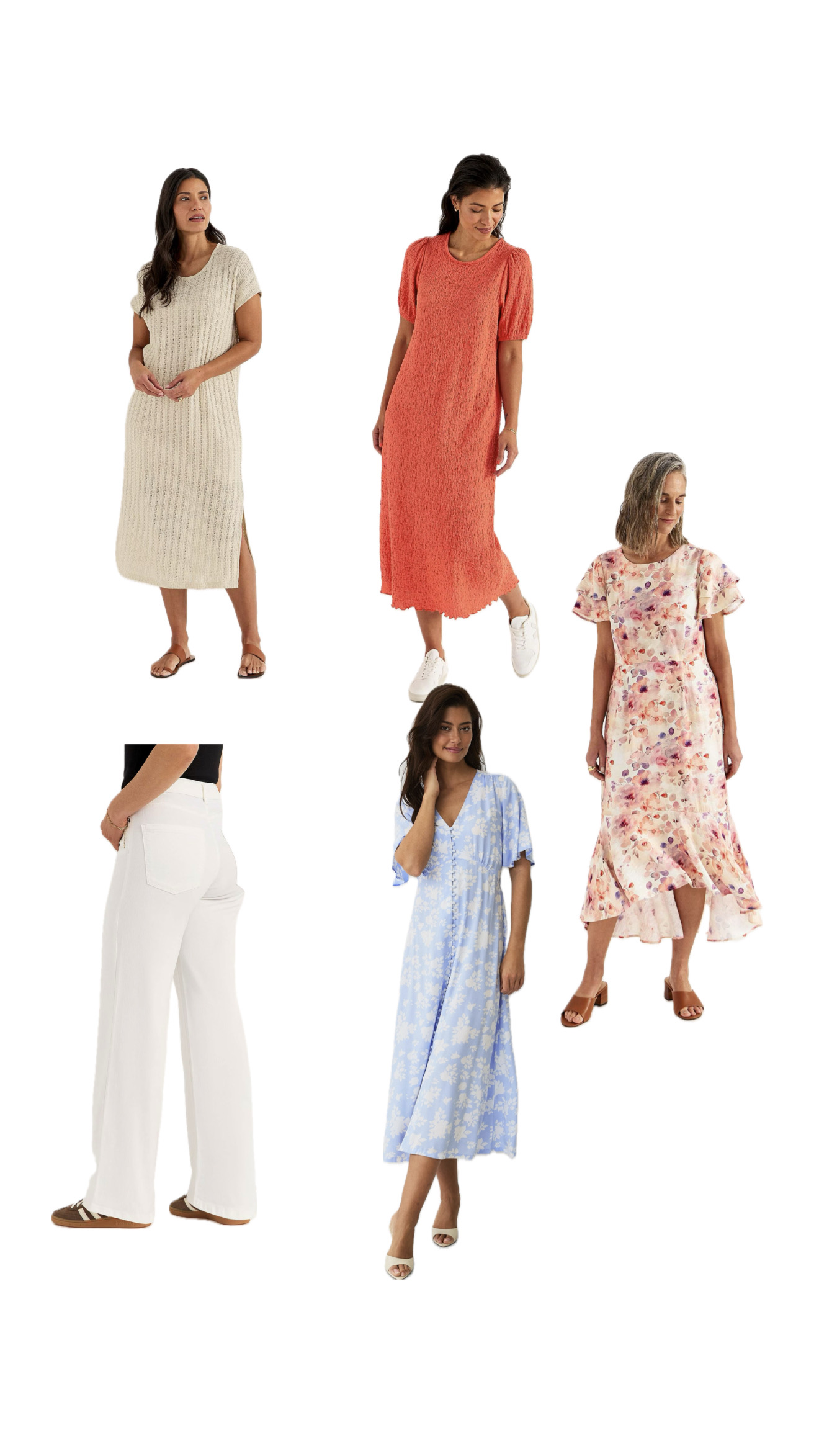 Vit klänning här, Hallonröd klänning här, Blommig klänning här, Vita byxor här, Blå klänning här